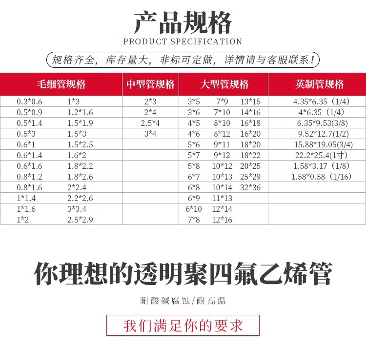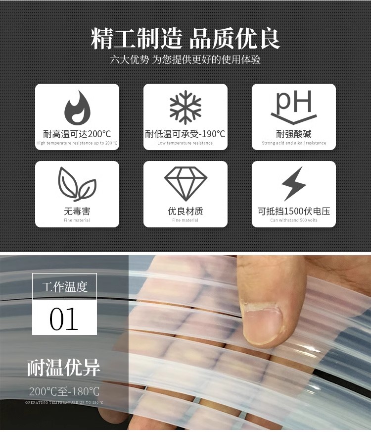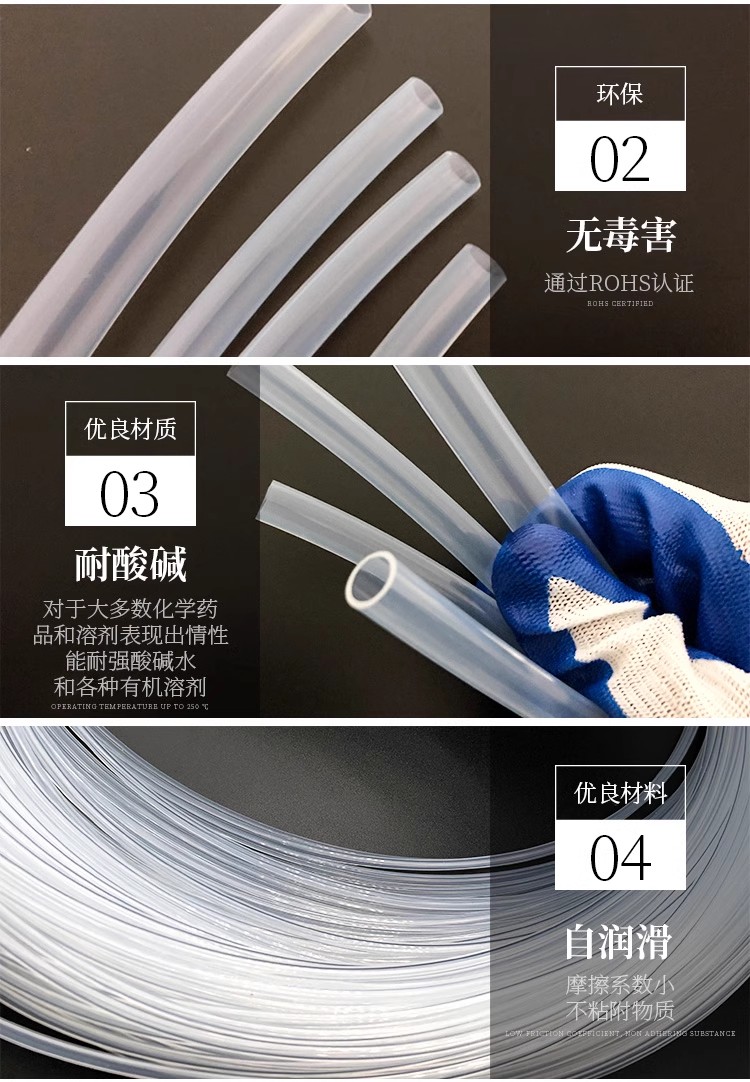 透明四氟管是一種以聚四氟乙烯(PTFE)為主要成分的管材,具有優良的耐熱、耐寒、耐腐蝕性能,可以在-180~260℃的溫度范圍內長期使用。它幾乎不溶于所有溶劑,具有極低的摩擦系數,因此不僅可以作為潤滑作用,還是易清潔水管內層的理想涂料。 透明四氟管具有透明度高、無毒、人體無害等特性,廣泛應用于化工、石油、電力、制藥、食品等領域。其獨特的耐高溫和耐腐蝕性能使其在高溫和惡劣環境下能夠保持穩定的性能表現。